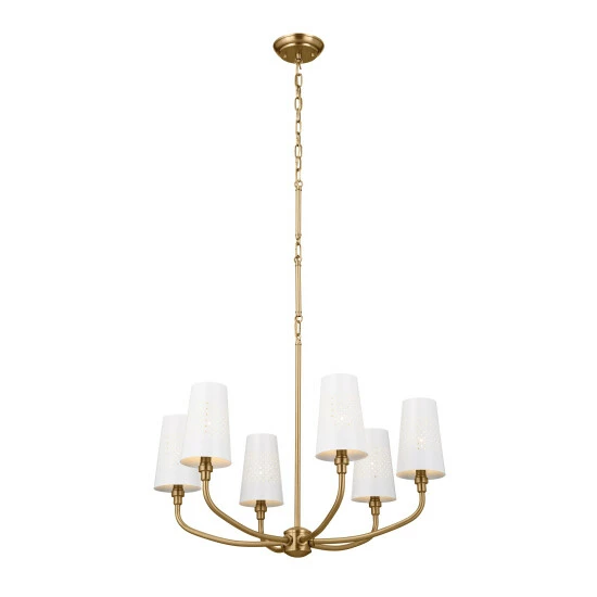 The Adeena collection illuminates in true elegance. As light delicately streams through its perforated shades, its glow instantly warms your space. As light delicately escapes Adeena’s elegantly perforated, white metal shades, it warms in romantic elegance. Its preassembled brushed natural brass stems are connected by links, giving it a unique detail while allowing you to easily adjust its height. Shades remove for easy cleaning.