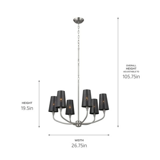 - What’s In the Box: (1) Canopy, (1) Fixture (with Preassembled Stems), (6) Steel Shades, (6) Candle Sleeves, (1) Mounting Hardware, Bulbs not included