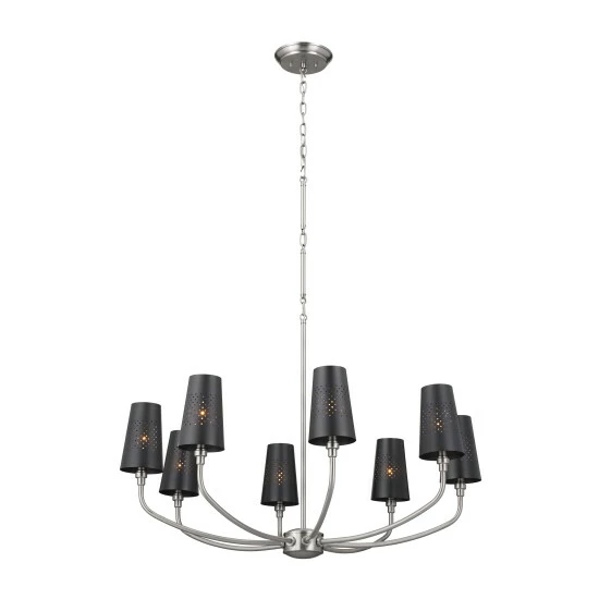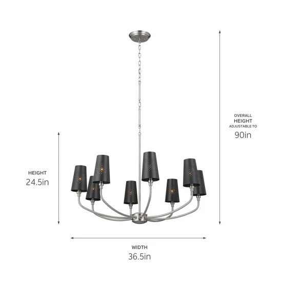 - What’s In the Box: (1) Canopy, (1) Fixture (with Preassembled Stems), (8) Steel Shades, (8) Candle Sleeves, (1) Mounting Hardware, Bulbs not included