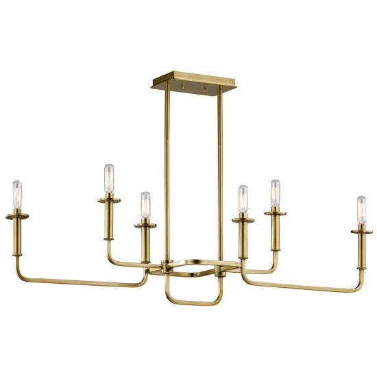 This Alden collection 6-light linear chandelier features a natural brass finish that will complement many traditional decors. The clean lines of the linear steel frame adds interest while the exposed bulbs will provide ample lighting to any space. This modern linear chandelier from the Alden collection features an asymmetrical linear design in a warm and beautiful natural brass finish creating a stunning yet simplistic look for your home. This piece includes 72 inches of stems and 99 inches of wire so it can be hung at your desired height (Up to 56 inches). Dimensions: 17.5 inches high x 38.5 inches wide x 11 inches deep. Turn on our fixtures, and watch your room transform even more. From lighting to ceiling fans Kichler collections are built around our simple philosophy of bringing you the effect you want for your home or business. Our collections coordinate from room-to-room, or let you mix and match from wall-to-ceiling. And each fixture is designed to deliver a stunning quality of light that makes your space more beautiful and more livable. As one of the largest, privately held residential lighting fixture companies in North America, we’re constantly working to create innovative and on-trend decorative products as well as knowledgeable support. Since 1938, we’ve been creating products that are not only well designed, but also practical. We invest millions of dollars each year in design, technology and testing to assure that we’re offering distributors, designers, installers and homeowners not only innovative technologies – but also fixtures that perform efficiently, install intuitively and deliver a premium source of light. This philosophy holds true for everything we create – from our wide variety of decorative fixtures to our award-winning landscape lighting to our ceiling fans.
