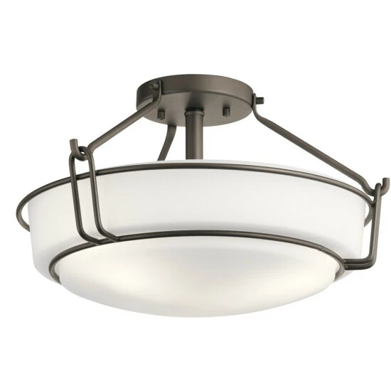 This Alkire collection 3-light semi-flush mount fixture features an olde bronze finish that will complement many transitional decors. The clean lines of the steel frame adds interest while the satin etched white glass shade softens the light creating a warm atmosphere for any space.