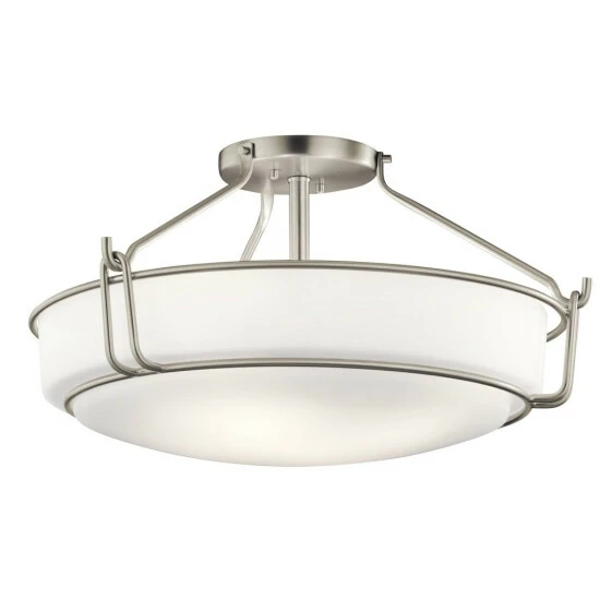 This Alkire collection 4-light semi-flush mount fixture features a brushed nickel finish that will complement many transitional decors. The clean lines of the steel frame adds interest while the satin etched white glass shade softens the light creating a warm atmosphere for any space.