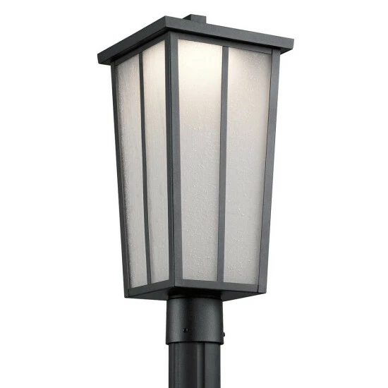 This Amber Valley collection 1-light outdoor LED post mount features a textured black finish that will complement many transitional decors. The etched seeded glass shade softens the light creating a warm welcoming glow to your outdoor decor. This LED post lantern from the Amber Valley outdoor collection features a simple, clean minimalist design. A perfect addition to any home’s exterior. Post is not included. Dimensions: 19.75 inches high x 8.5 inch diameter. Turn on our fixtures, and watch your room transform even more. From lighting to ceiling fans Kichler collections are built around our simple philosophy of bringing you the effect you want for your home or business. Our collections coordinate from room-to-room, or let you mix and match from wall-to-ceiling. And each fixture is designed to deliver a stunning quality of light that makes your space more beautiful and more livable. As one of the largest, privately held residential lighting fixture companies in North America, we’re constantly working to create innovative and on-trend decorative products as well as knowledgeable support. Since 1938, we’ve been creating products that are not only well designed, but also practical. We invest millions of dollars each year in design, technology and testing to assure that we’re offering distributors, designers, installers and homeowners not only innovative technologies – but also fixtures that perform efficiently, install intuitively and deliver a premium source of light. This philosophy holds true for everything we create – from our wide variety of decorative fixtures to our award-winning landscape lighting to our ceiling fans.