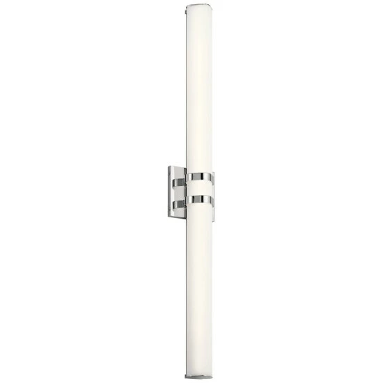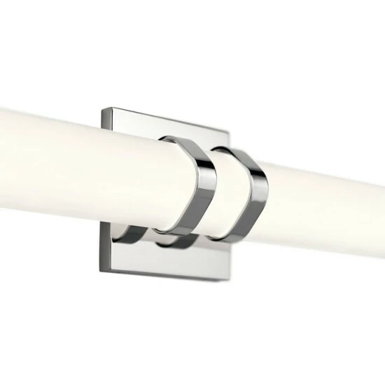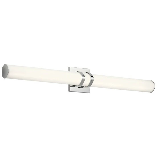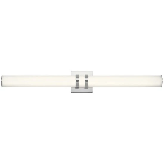 This Amira collection 36-inch LED linear bath/vanity bar features a chrome finish that will complement many contemporary and modern decors. The clean, white satin etched glass softens the light creating an inviting atmosphere for any space. This Amira linear bath light’s slim design makes a statement without overtaking a space. The satin etched white glass features an diamond shape, combining gentle curves with modern geometric form. The highly energy efficient LED projects a soft, white light that won’t wash out colors that is ideal for applying makeup or shaving. The 2470 delivered Lumens is equivalent to around a 150 W Incandescent bulb. Dimensions: 5 inches high x 36.5 inches wide x 3.25 inches deep.