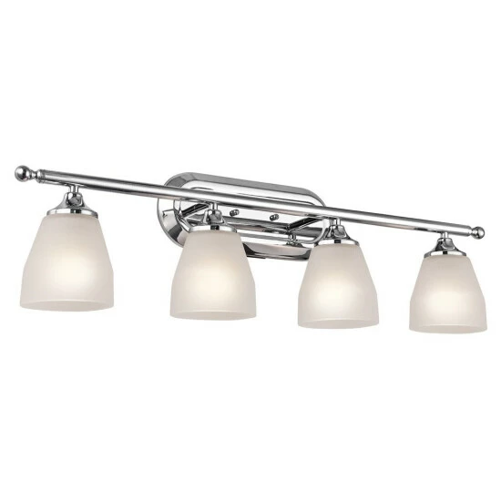 This Ansonia collection 4-light bath/vanity light features a chrome finish that will complement many contemporary and modern decors. The clean lines of the steel frame add interest while satin etched glass shades soften the light to create a warm ambiance and completes this simple yet functional design. Dimensions: 8.75 inches high x 31.25 inches wide x 5.5 inches deep. Turn on our fixtures, and watch your room transform even more. From lighting to ceiling fans Kichler collections are built around our simple philosophy of bringing you the effect you want for your home or business. Our collections coordinate from room-to-room, or let you mix and match from wall-to-ceiling. And each fixture is designed to deliver a stunning quality of light that makes your space more beautiful and more livable. As one of the largest, privately held residential lighting fixture companies in North America, we’re constantly working to create innovative and on-trend decorative products as well as knowledgeable support. Since 1938, we’ve been creating products that are not only well designed, but also practical. We invest millions of dollars each year in design, technology and testing to assure that we’re offering distributors, designers, installers and homeowners not only innovative technologies – but also fixtures that perform efficiently, install intuitively and deliver a premium source of light. This philosophy holds true for everything we create – from our wide variety of decorative fixtures to our award-winning landscape lighting to our ceiling fans.