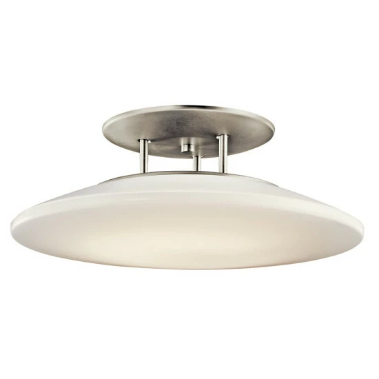 This Ara collection 1-light fluorescent semi flush mount fixture features a brushed nickel finish that will complement many contemporary and modern decors. The tapered acrylic diffuser softens the light and completes this simple yet functional design. This semi-flush ceiling light from the Kichler Ara collection features a shallow, tapered saucer of white acrylic, accented with brushed nickel and tucked close to the ceiling. This collection of fluorescent fixtures is the perfect blend of cost saving energy efficient lighting and contemporary good taste. Dimensions: 8 inches high x 20 inch diameter. Turn on our fixtures, and watch your room transform even more. From lighting to ceiling fans Kichler collections are built around our simple philosophy of bringing you the effect you want for your home or business. Our collections coordinate from room-to-room, or let you mix and match from wall-to-ceiling. And each fixture is designed to deliver a stunning quality of light that makes your space more beautiful and more livable. As one of the largest, privately held residential lighting fixture companies in North America, we’re constantly working to create innovative and on-trend decorative products as well as knowledgeable support. Since 1938, we’ve been creating products that are not only well designed, but also practical. We invest millions of dollars each year in design, technology and testing to assure that we’re offering distributors, designers, installers and homeowners not only innovative technologies – but also fixtures that perform efficiently, install intuitively and deliver a premium source of light. This philosophy holds true for everything we create – from our wide variety of decorative fixtures to our award-winning landscape lighting to our ceiling fans.