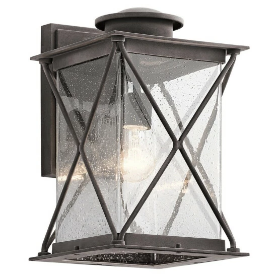 This Argyle collection 1-light outdoor wall lantern features a weathered zinc finish that will complement many lodge, country, and rustic decors. The clean lines of the aluminum frame adds interest while clear seedy glass panels soften the light for a warm welcoming glow. Argyle’s outdoor wall lantern showcases a lodge-inspired design that brings a distinctive look to your curb-appeal. This fixture features a crisscross pattern, a beautiful weathered zinc finish and clear seeded glass. When creating an aesthetic atmosphere, nothing compares to Argyle. Dimensions: 15 inches high x 9.5 inches wide x 11 inches deep.