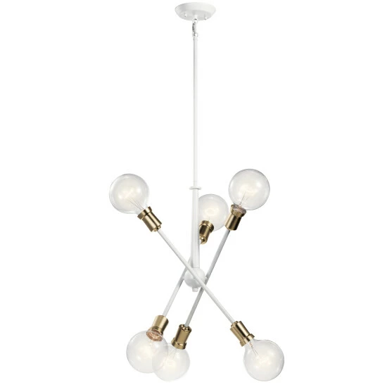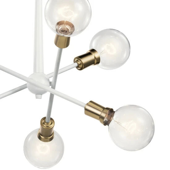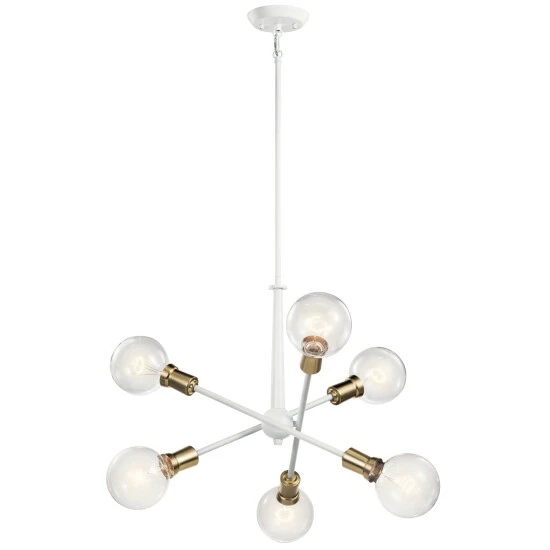 This Mid-Century 6-light chandelier in White from the Armstrong collection features a in.sputnikin. design with adjustable arms allowing you to customize the light for just the right look.