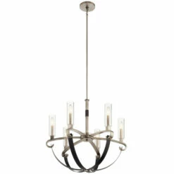 The Artem 26″ 6 light chandelier features a rustic modern look with its shepherd’s hook Classic Pewter finish arms and clear glass cylinders. A perfect addition in several aesthetic environments, including lodge, modern, transitional. The Artem 6 light chandelier with clear glass cylinders in Classic Pewter finish combines classic elements with rustic and modern touches. This chandelier uses 60 watt (max.) candelabra bulb equivalent. It measures 27″ in width with a body height of 26″.