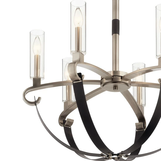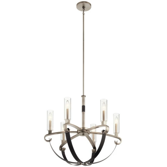 - 26″, six light chandelier with clear glass cylinders and Classic Pewter finish.
