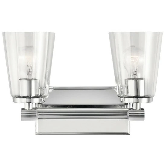 This Audrea collection 2-light bath/vanity light features a chrome finish that will complement many transitional decors. Clean lines of the steel frame add interest while the clear optic glass shades give a unique look for any bathroom or vanity space.