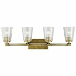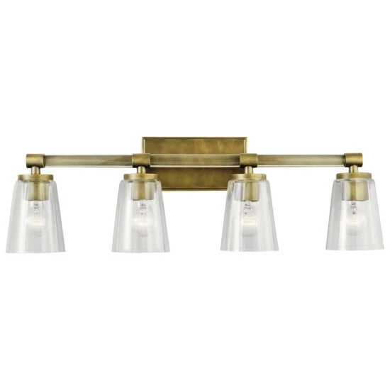 This Audrea collection 4-light bath/vanity light features a natural brass finish that will complement many transitional decors. Clean lines of the steel frame add interest while the clear optic glass shades give a unique look for any bathroom or vanity space.