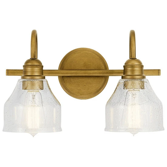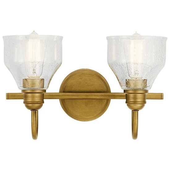 Create a masterpiece with this 2 light bath light from the Avery collection. In a Natural Brass finish with Clear Seeded glass.