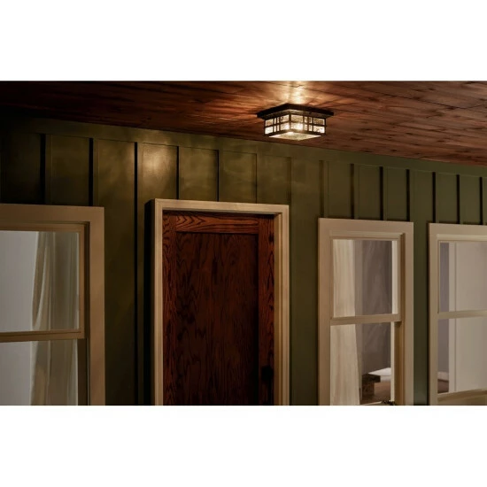 Brighten your door step with this Beacon Square collection flush-mount light. This handsome outdoor fixture has a rich olde-bronze finish that pairs well with modern exterior designs, and the clear hammered glass adds texture to the fixture. The dual-light construction casts bright lighting into your alcove to help with nighttime safety while entering your home.