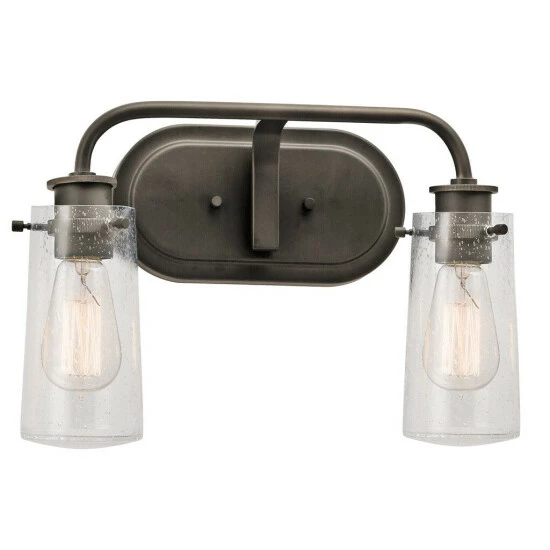 Revamp your bathroom lighting in a vintage industrial style with this vanity light from the Braelyn collection. Seedy glass shades pair with a bronze finish for a heritage look that melds well with antique filament bulbs. The clear shades allow quality illumination for applying makeup or shaving.