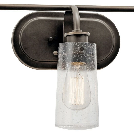 Perfect your bathroom’s rustic or industrial style with this three-light vanity fixture. Old bronze-finished steel forms the sturdy, bold base for the three lights with gently curved arms to aim the light where you need it. Clear seedy glass shades add a vintage feel to this fixture while letting light flow freely down to your mirror.