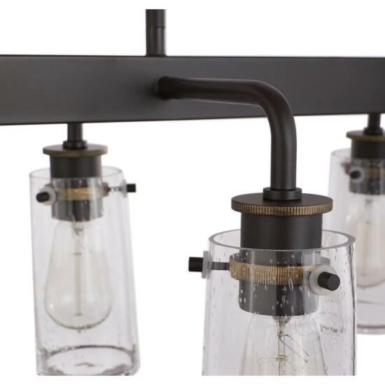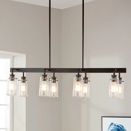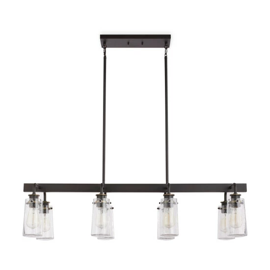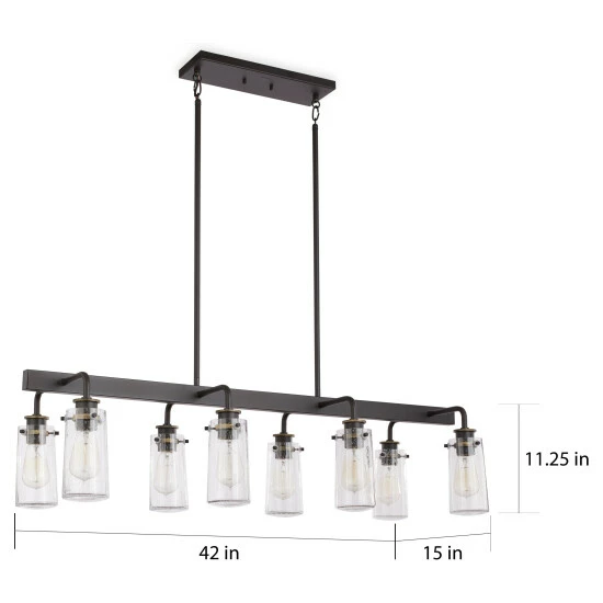 This Braelyn collection 8-light linear chandelier features an olde bronze finish that will complement many lodge, country, and rustic decors. Clean lines of the frame add interest while clear seedy glass shades allow the light to bounce in different ways. There’s so much to love about the reclaimed style of this linear chandelier from the Braelyn(TM) collection. The vintage industrial design is punctuated with clear seedy glass shades, reminiscent of glass jars that were a staple of 19th century American life. The carbon filament replica light bulbs enhance this style, making the fixtures the perfect addition to any spaces. This piece includes 36 inches of stems and 110 inches of wire so it can be hung at your desired height (up to 50 inches). Dimensions: 11.25 inches high x 42 inches wide x 15 inches deep. Turn on our fixtures, and watch your room transform even more. From lighting to ceiling fans Kichler collections are built around our simple philosophy of bringing you the effect you want for your home or business. Our collections coordinate from room-to-room, or let you mix and match from wall-to-ceiling. And each fixture is designed to deliver a stunning quality of light that makes your space more beautiful and more livable. As one of the largest, privately held residential lighting fixture companies in North America, we’re constantly working to create innovative and on-trend decorative products as well as knowledgeable support. Since 1938, we’ve been creating products that are not only well designed, but also practical. We invest millions of dollars each year in design, technology and testing to assure that we’re offering distributors, designers, installers and homeowners not only innovative technologies – but also fixtures that perform efficiently, install intuitively and deliver a premium source of light. This philosophy holds true for everything we create – from our wide variety of decorative fixtures to our award-winning landscape lighting to our ceiling fans.