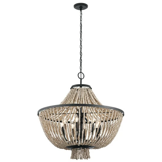 This Brisbane collection 8-light chandelier features a distressed black finish that will complement many transitional decors. The basket shaped wooden beads surrounding the bulb cluster adds interest and gives the light a unique look. A little bit elegant, a little bit rustic, the Brisbane collection allows you to bring pretty detailing to a room without overdoing it. The unique basket shaped styles feature distressed antique white beads set against a distressed black finish, for a chic look that’s as elegant as it is casual. This piece includes 72 inches of chain and 60 inches wire so it can be hung at your desired height (Up to 106 inches). Dimensions: 31.75 inches high x 30 inch diameter. Turn on our fixtures, and watch your room transform even more. From lighting to ceiling fans Kichler collections are built around our simple philosophy of bringing you the effect you want for your home or business. Our collections coordinate from room-to-room, or let you mix and match from wall-to-ceiling. And each fixture is designed to deliver a stunning quality of light that makes your space more beautiful and more livable. As one of the largest, privately held residential lighting fixture companies in North America, we’re constantly working to create innovative and on-trend decorative products as well as knowledgeable support. Since 1938, we’ve been creating products that are not only well designed, but also practical. We invest millions of dollars each year in design, technology and testing to assure that we’re offering distributors, designers, installers and homeowners not only innovative technologies – but also fixtures that perform efficiently, install intuitively and deliver a premium source of light. This philosophy holds true for everything we create – from our wide variety of decorative fixtures to our award-winning landscape lighting to our ceiling fans.
