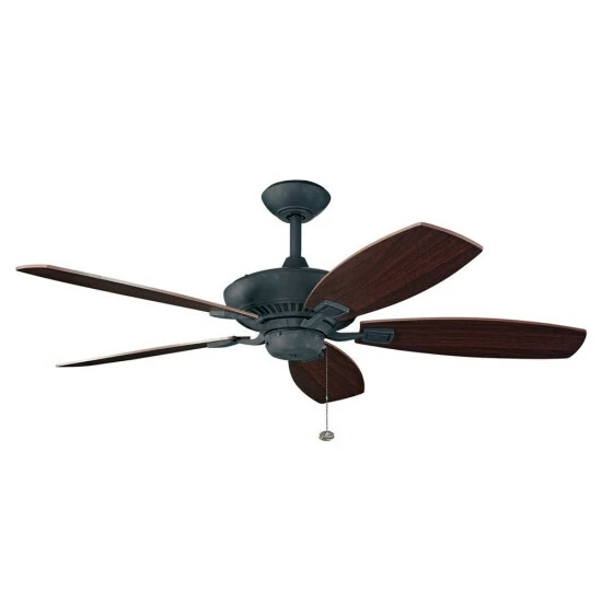 This 52-inch, 5 blade ceiling fan from the Canfield collection features a distressed black finish that will subtly highlight the existing decor in your home. This attractive fan will complement many traditional decors. With a distressed black finish, this fan is a wonderful addition to the Kichler Canfield(TM) collection. The 5 blades are pitched 14 degrees and are reversible with walnut and American walnut finishes. The 172mm x 20mm Motor will provide the quiet power you need. This fan comes complete with a pull chain (3 speeds forward and reverse) and 1 4 inch downrod. It is low ceiling adaptable. Dimensions: 13.5 inches high x 52 inch diameter. Turn on our fixtures, and watch your room transform even more. From lighting to ceiling fans Kichler collections are built around our simple philosophy of bringing you the effect you want for your home or business. Our collections coordinate from room-to-room, or let you mix and match from wall-to-ceiling. And each fixture is designed to deliver a stunning quality of light that makes your space more beautiful and more livable. As one of the largest, privately held residential lighting fixture companies in North America, we’re constantly working to create innovative and on-trend decorative products as well as knowledgeable support. Since 1938, we’ve been creating products that are not only well designed, but also practical. We invest millions of dollars each year in design, technology and testing to assure that we’re offering distributors, designers, installers and homeowners not only innovative technologies – but also fixtures that perform efficiently, install intuitively and deliver a premium source of light. This philosophy holds true for everything we create – from our wide variety of decorative fixtures to our award-winning landscape lighting to our ceiling fans.