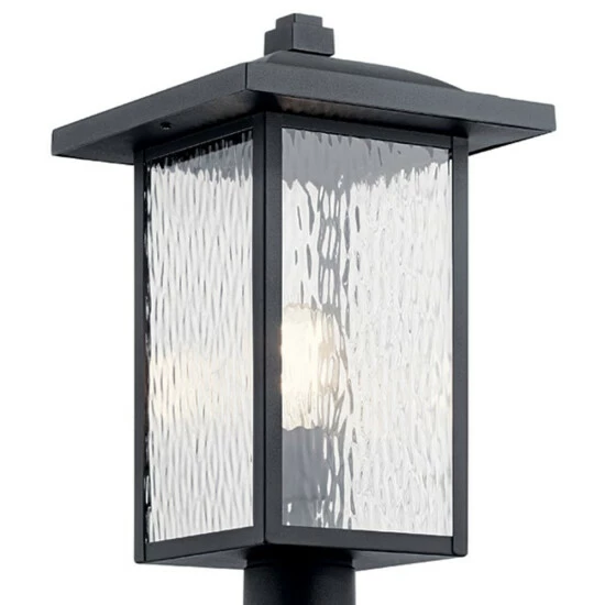 This Capanna collection 1-light outdoor wall lantern features a textured black finish that will complement many transitional decors. Clean lines and a classic design add interest while the clear water glass shade provides a unique look to the light for your outdoor decor.