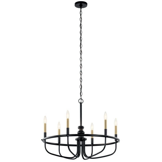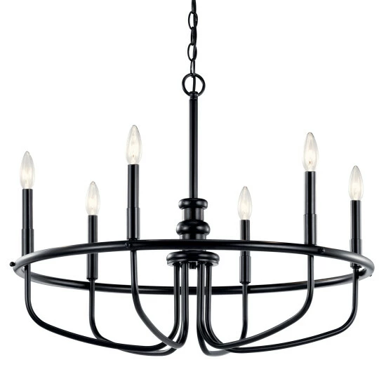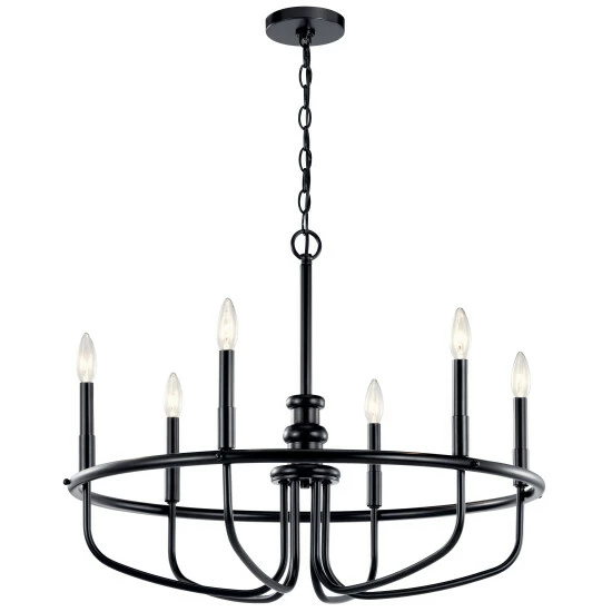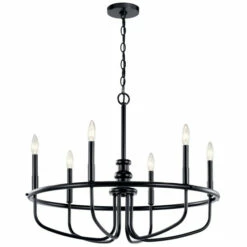 The Capitol Hill 22″ 6 light chandelier features basket inspired curved arms that adds dimension and visual interest with its Black finish. This fixture comes with two sets of candle sleeves in different finishes: black for a continuous look and classic bronze for a pop of color. The Capitol Hill 6 light chandelier in Black finish is a timeless design that coordinates with many decors and styles. This chandelier uses a 60 watt (max.) candelabra bulb equivalent. It measures 28.75″ in width with a body height of 22″.