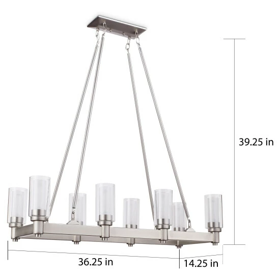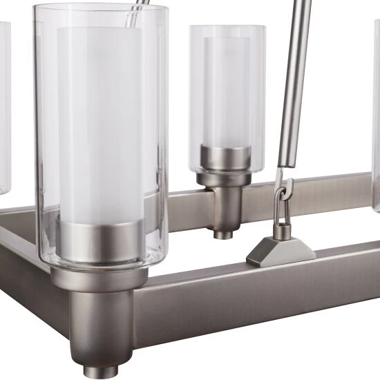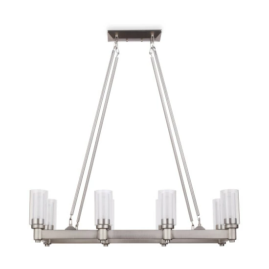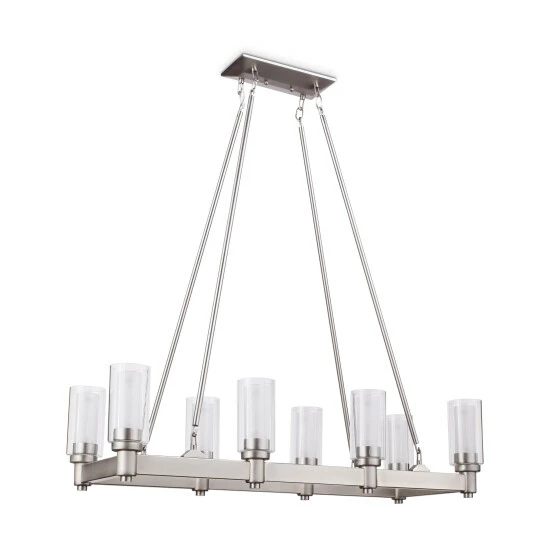 This Circolo collection 8-light linear chandelier features a brushed nickel finish that will complement many contemporary decors. The clean lines of the rectangular frame add interest while the etched glass diffusers are encased inside clear glass cylinders and will produce a warm ambiance to any space. Dimensions: 39.25 inches high x 14.25 inches wide x 36.25 inches deep. Turn on our fixtures, and watch your room transform even more. From lighting to ceiling fans Kichler collections are built around our simple philosophy of bringing you the effect you want for your home or business. Our collections coordinate from room-to-room, or let you mix and match from wall-to-ceiling. And each fixture is designed to deliver a stunning quality of light that makes your space more beautiful and more livable. As one of the largest, privately held residential lighting fixture companies in North America, we’re constantly working to create innovative and on-trend decorative products as well as knowledgeable support. Since 1938, we’ve been creating products that are not only well designed, but also practical. We invest millions of dollars each year in design, technology and testing to assure that we’re offering distributors, designers, installers and homeowners not only innovative technologies – but also fixtures that perform efficiently, install intuitively and deliver a premium source of light. This philosophy holds true for everything we create – from our wide variety of decorative fixtures to our award-winning landscape lighting to our ceiling fans.