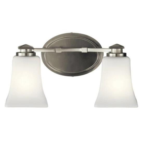 This Clare collection 2-light bath/vanity light features a brushed nickel finish that will complement many traditional decors. Clean lines of the steel frame add interest while satin etched cased opal glass shades soften the light to create a warm ambiance for any bathroom or vanity space.