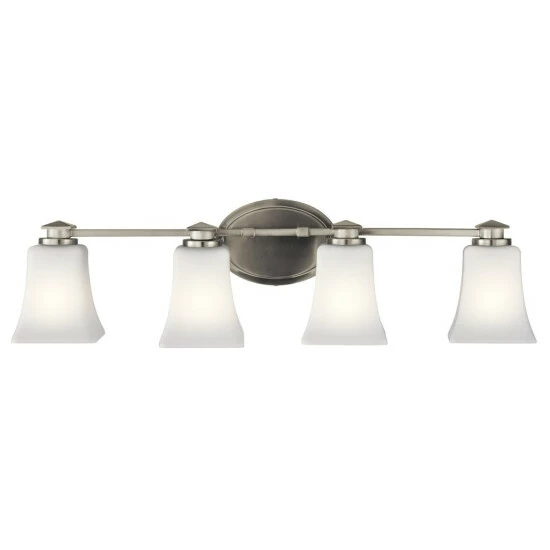 This Clare collection 4-light bath/vanity light features a brushed nickel finish that will complement many traditional decors. Clean lines of the steel frame add interest while satin etched cased opal glass shades soften the light to create a warm ambiance for any bathroom or vanity space.