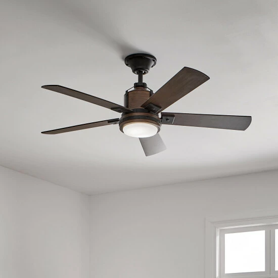 This Colerne collection 52-inch, 5 blade LED ceiling fan features a distressed black finish that will subtly highlight the existing decor in your home. This attractive fan will complement many transitional and industrial decors. You’ll love the flea market find-feel that this ceiling fan from the Colerne collection brings to your space. The Auburn Stain on all 5 blades creates the look of a wooden box up cycled into something that’s at home in both a rustic lodge or a New York loft. The vintage industrial design comes to life with a Distressed Black finish on the metal accents.
