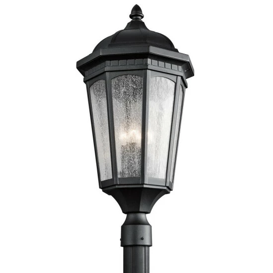 This Courtyard collection 3-light outdoor post lantern features a textured black finish that will complement many traditional decors. Clean lines and a classic design adds interest while etched seedy glass panels provide a unique look to your outdoor decor. Uncluttered and traditional, the Courtyard(TM) collection adds the warmth of a secluded terrace to any patio or porch. Featuring a textured black finish and etched seedy glass, this design will elevate and enhance any space. Post not included. Dimensions: 27 inches high x 12.25 inch diameter. Turn on our fixtures, and watch your room transform even more. From lighting to ceiling fans Kichler collections are built around our simple philosophy of bringing you the effect you want for your home or business. Our collections coordinate from room-to-room, or let you mix and match from wall-to-ceiling. And each fixture is designed to deliver a stunning quality of light that makes your space more beautiful and more livable. As one of the largest, privately held residential lighting fixture companies in North America, we’re constantly working to create innovative and on-trend decorative products as well as knowledgeable support. Since 1938, we’ve been creating products that are not only well designed, but also practical. We invest millions of dollars each year in design, technology and testing to assure that we’re offering distributors, designers, installers and homeowners not only innovative technologies – but also fixtures that perform efficiently, install intuitively and deliver a premium source of light. This philosophy holds true for everything we create – from our wide variety of decorative fixtures to our award-winning landscape lighting to our ceiling fans.