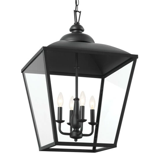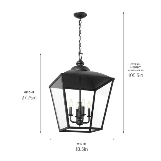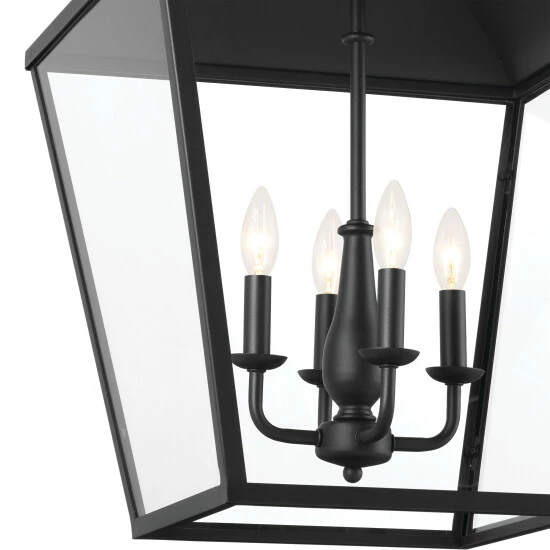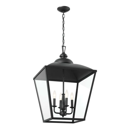 Elegant and romantic, the Dame collection refreshes the traditional lantern. With its divine details, refined finishes, and vintage flair, Dame is both sophisticated and charming. The Dame 4 light foyer pendant refreshes the traditional lantern. Its oversized Textured Black hood, elegant details, and candlestick lights through Clear Glass panes infuse old-world charm into your space.