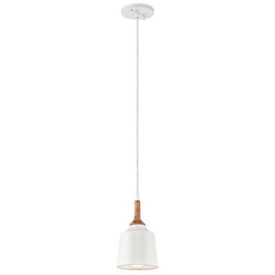 This Danika collection 1-light mini pendant features a white finish that will complement many transitional decors. The wood accent adds texture and interest and completes this simple yet functional design. This piece includes enough wire to hang at your desired height (up to 115 inches). Dimensions: 9.25 inches high x 5.25 inch diameter. Turn on our fixtures, and watch your room transform even more. From lighting to ceiling fans Kichler collections are built around our simple philosophy of bringing you the effect you want for your home or business. Our collections coordinate from room-to-room, or let you mix and match from wall-to-ceiling. And each fixture is designed to deliver a stunning quality of light that makes your space more beautiful and more livable. As one of the largest, privately held residential lighting fixture companies in North America, we’re constantly working to create innovative and on-trend decorative products as well as knowledgeable support. Since 1938, we’ve been creating products that are not only well designed, but also practical. We invest millions of dollars each year in design, technology and testing to assure that we’re offering distributors, designers, installers and homeowners not only innovative technologies – but also fixtures that perform efficiently, install intuitively and deliver a premium source of light. This philosophy holds true for everything we create – from our wide variety of decorative fixtures to our award-winning landscape lighting to our ceiling fans.