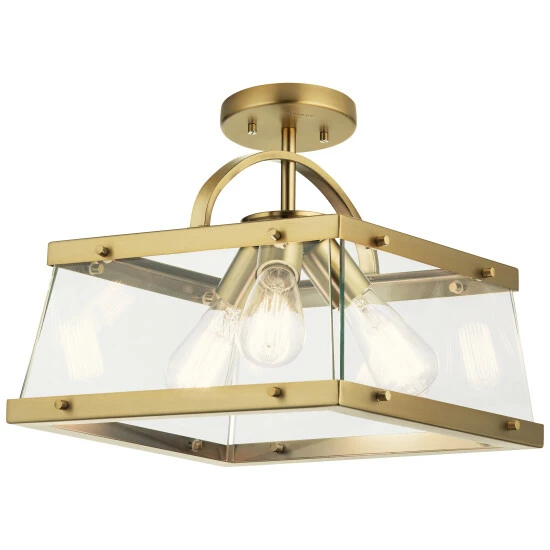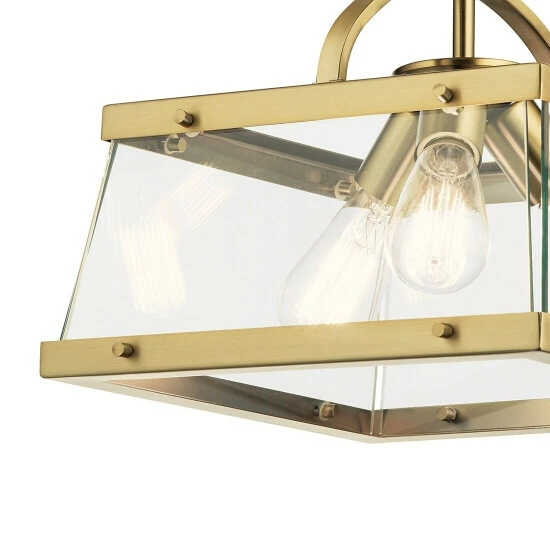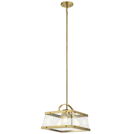 - 13.75″, three light convertible pendant/semi flush with clear glass in Natural Brass finish.