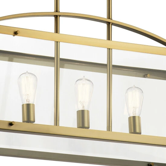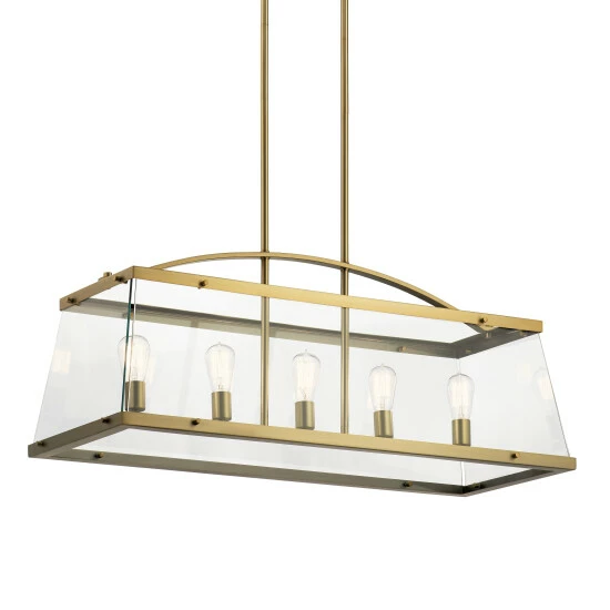 - 40.75″, five light linear chandelier with clear glass in Brushed Natural Brass finish.