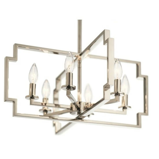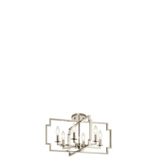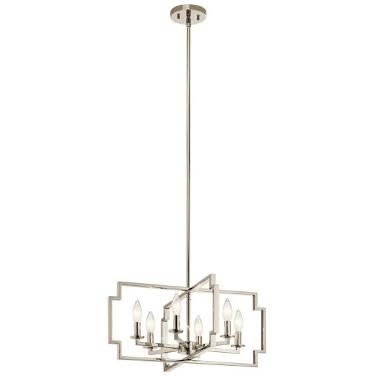 This Downtown Deco collection 6-light convertible chandelier/semi-flush mount features a polished nickel finish that will complement many transitional decors. The clean lines of steel frame add interest while the exposed bulbs provide ample light making this the perfect piece for any space.