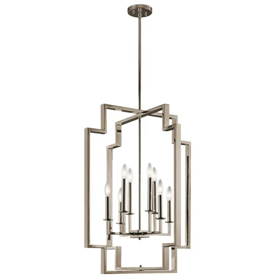 This Downtown Deco collection 8-light foyer pendant features a polished nickel finish that will complement many transitional decors. The interlocking geometrical lines of the steel frame add interest while the exposed bulbs will provide ample lighting. Inspired by the geometric lines found in contemporary furniture, this Downtown Deco foyer pendant brings a soft dose of modern style to a room. The squared edges of the outer frames surround the curved candles, allowing the light to fully shine through. This piece includes 36 inches of stems and 51 inches of wire so it can be hung at your desired height (Up to 70 inches). Dimensions: 32.25 inches high x 24 inch diameter. Turn on our fixtures, and watch your room transform even more. From lighting to ceiling fans Kichler collections are built around our simple philosophy of bringing you the effect you want for your home or business. Our collections coordinate from room-to-room, or let you mix and match from wall-to-ceiling. And each fixture is designed to deliver a stunning quality of light that makes your space more beautiful and more livable. As one of the largest, privately held residential lighting fixture companies in North America, we’re constantly working to create innovative and on-trend decorative products as well as knowledgeable support. Since 1938, we’ve been creating products that are not only well designed, but also practical. We invest millions of dollars each year in design, technology and testing to assure that we’re offering distributors, designers, installers and homeowners not only innovative technologies – but also fixtures that perform efficiently, install intuitively and deliver a premium source of light. This philosophy holds true for everything we create – from our wide variety of decorative fixtures to our award-winning landscape lighting to our ceiling fans.