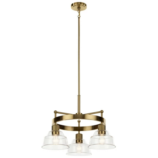 - The Eastmont 3 light chandelier features Brushed Natural Brass with fine ribbed detailing on the sockets and double-tiered Clear Glass shades