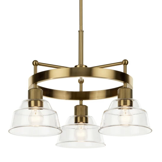 The Eastmont 3 light chandelier is undeniably remarkable. Brushed Natural Brass arms and fine ribbed detailing on the socket set the scene for the Clear Glass double-tiered shades, making this one of our most sophisticated and versatile fixtures. Its refined, luxe-industrial feel adds sophistication to a more vintage space, and alternately adds some edge to a modern space.