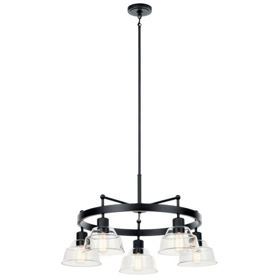 - The Eastmont 5 light chandelier features a Black wagon wheel with fine ribbed detailing on the sockets and a double-tiered Clear Glass shades