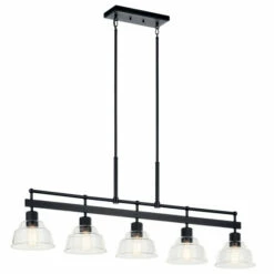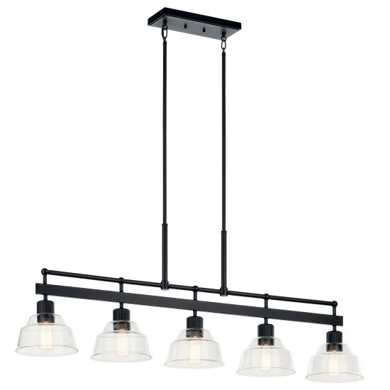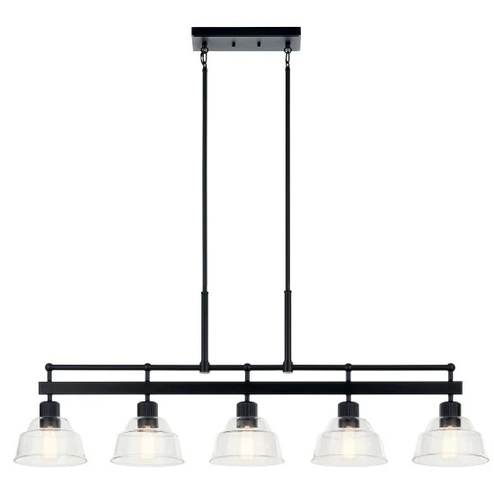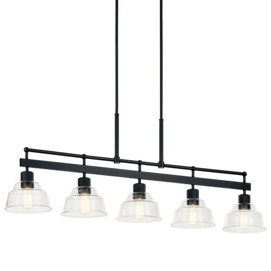 - The Eastmont 5 light linear chandelier features Black with fine ribbed detailing on the sockets and a double-tiered Clear Glass shades
