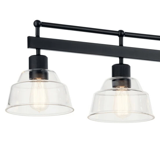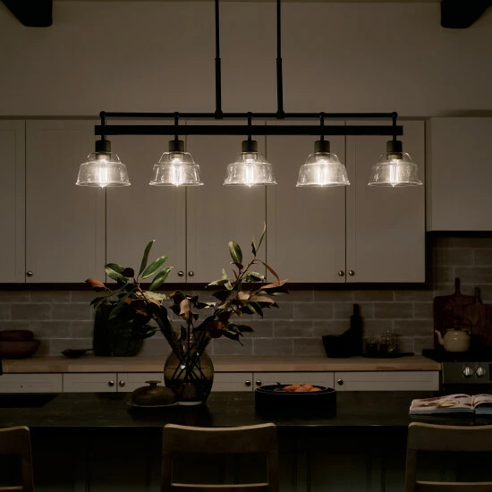 The Eastmont 5 light linear chandelier is undeniably remarkable. Black accents and fine ribbed detailing on the sockets set the scene for the Clear Glass double-tiered shades, making this one of our most sophisticated and versatile fixtures. Its refined, luxe-industrial feel adds sophistication to a more vintage space, and alternately adds some edge to a modern space .