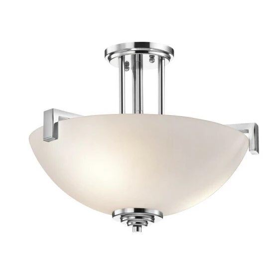 This Eileen collection 3-light semi flush mount features a chrome finish that will complement many contemporary and modern decors. The clean lines of the steel frame adds interest while the white etched glass bowl shade softens the light to create a warm ambiance. Named after famed furniture designer Eileen Gray, The Eileen collection features a clean, straight linear construction with simple glass for a style that is as unique and contemporary as Eileen Gray’s. The elegance of our chrome finish complements the white etched glass perfectly to give the Eileen collection added ambiance that is ideal for today’s ever-evolving aesthetic. Dimensions: 14.5 inches high x 17.25 inch diameter. Turn on our fixtures, and watch your room transform even more. From lighting to ceiling fans Kichler collections are built around our simple philosophy of bringing you the effect you want for your home or business. Our collections coordinate from room-to-room, or let you mix and match from wall-to-ceiling. And each fixture is designed to deliver a stunning quality of light that makes your space more beautiful and more livable. As one of the largest, privately held residential lighting fixture companies in North America, we’re constantly working to create innovative and on-trend decorative products as well as knowledgeable support. Since 1938, we’ve been creating products that are not only well designed, but also practical. We invest millions of dollars each year in design, technology and testing to assure that we’re offering distributors, designers, installers and homeowners not only innovative technologies – but also fixtures that perform efficiently, install intuitively and deliver a premium source of light. This philosophy holds true for everything we create – from our wide variety of decorative fixtures to our award-winning landscape lighting to our ceiling fans.