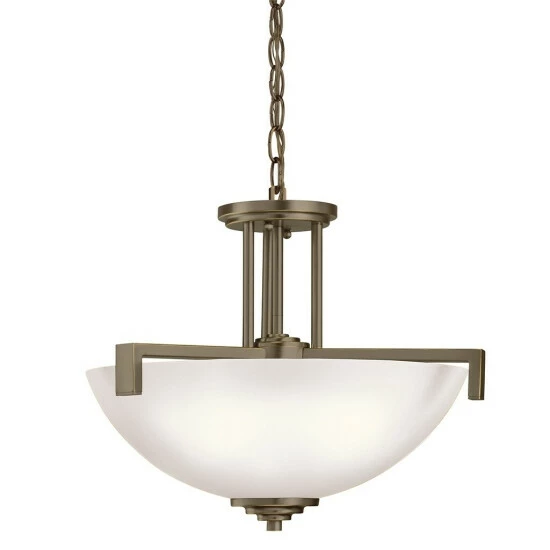 This Eileen collection 3-light convertible LED inverted pendant/semi-flush mount features an olde bronze finish that will complement many contemporary and modern decors. The clean lines of the steel frame add interest while the satin etched glass softens the light to create a warm ambiance. This pendant/semi-flush mount from the Eileen collection features a clean, straight linear construction with simple glass for a style that is as unique and contemporary as Eileen Gray. The warm elegance of our olde bronze finish complements the satin etched white glass perfectly to give the Eileen collection the added ambiance that is ideal for today’s ever-evolving aesthetic. This fixture features LED light bulbs which are Energy-Star certified. This piece comes with all the necessary hardware to convert this piece into a semi-flush mount fixture. This piece includes 36 inches of chain and 10 inches of wire so it can be hung at your desired height (up to 52.5 inches high). Dimensions: 14.5 inches high x 17.25 inch diameter.