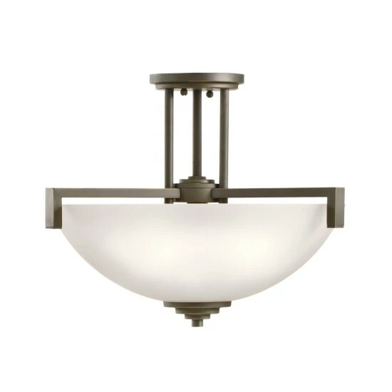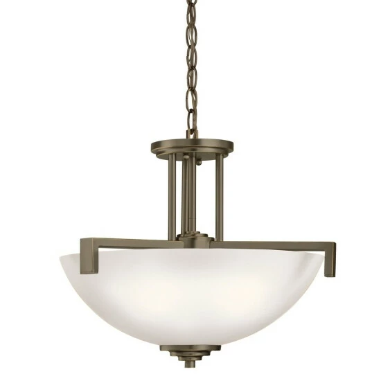 - Beautiful Olde Bronze finish with a Satin Etched White glass shade.