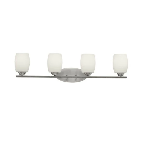 This Eileen collection 4-light LED bath/vanity fixture features a brushed nickel finish that will complement many contemporary and modern decors. The clean lines of the steel frame adds interest while the satin etched cased opal glass shades soften the light to create a warm ambiance. Named after famed furniture designer Eileen Gray, this wall sconce from the Eileen collection features a clean, straight linear construction. The fresh, weightless elegance of our brushed nickel finish complements the white etched glass perfectly to give the Eileen Collection the added ambiance that is ideal for today’s ever-evolving aesthetic. This fixture features an LED Light Bulb which is Energy-Star certified.