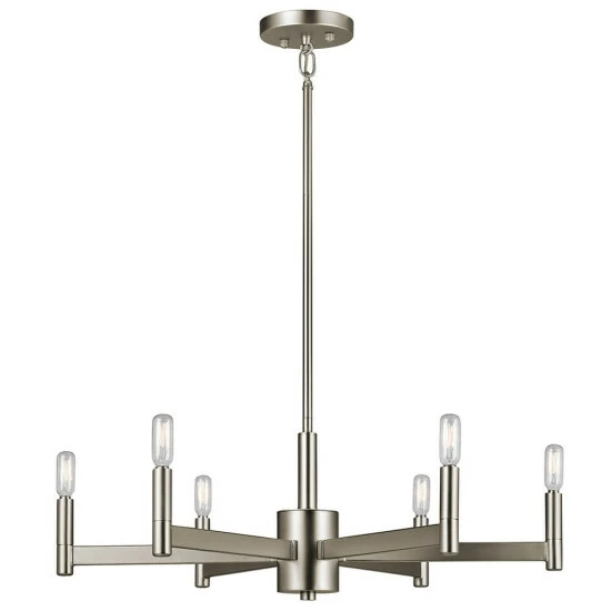 This Erzo collection 6-light chandelier features a satin nickel finish that will complement many contemporary and modern decors. The clean lines of the steel frame, housing the exposed bulbs, add interest while providing ample lighting to any space. The soft contemporary Erzo collection is ideal anywhere you want a modern touch. The simple, sleek lines create a stylish accent for your home. This piece includes 36 inches of stems and 69 inches of wire so it can be hung at your desired height (up to 48 inches high). Dimensions: 9.25 inches high x 26 inch diameter. Turn on our fixtures, and watch your room transform even more. From lighting to ceiling fans Kichler collections are built around our simple philosophy of bringing you the effect you want for your home or business. Our collections coordinate from room-to-room, or let you mix and match from wall-to-ceiling. And each fixture is designed to deliver a stunning quality of light that makes your space more beautiful and more livable. As one of the largest, privately held residential lighting fixture companies in North America, we’re constantly working to create innovative and on-trend decorative products as well as knowledgeable support. Since 1938, we’ve been creating products that are not only well designed, but also practical. We invest millions of dollars each year in design, technology and testing to assure that we’re offering distributors, designers, installers and homeowners not only innovative technologies – but also fixtures that perform efficiently, install intuitively and deliver a premium source of light. This philosophy holds true for everything we create – from our wide variety of decorative fixtures to our award-winning landscape lighting to our ceiling fans.