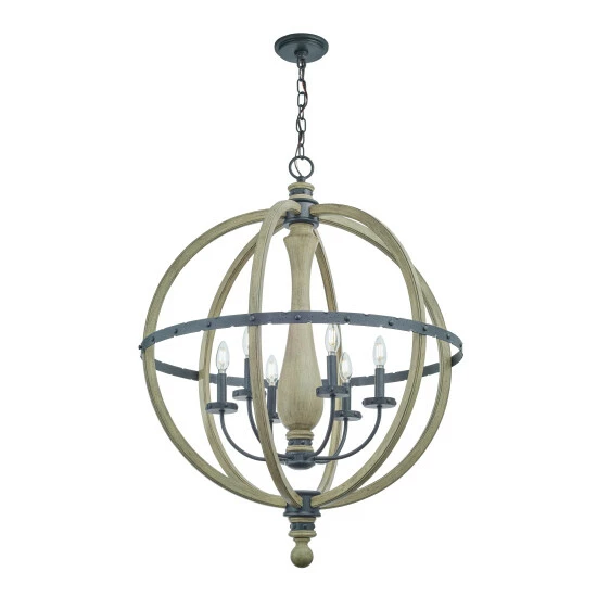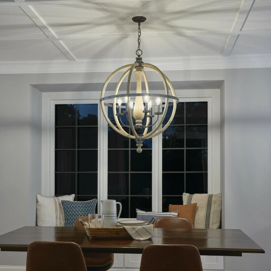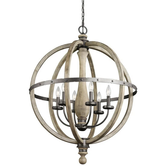This 6-light chandelier from the Evan collection features a distressed antique gray finish that will complement many lodge, loft, country, and rustic decors. The sphere shaped steel frame is wrapped with hammered metal and will add interest to any space. Distressed woods. Hammered metals. Endless charm. The Evan(TM) collection will effortlessly elevate and enhance any space in your home. The center column grounds each piece with a furniture-style shape, and the light wood tones coordinate with a rich Distressed Antique Gray Wood finish and Anvil Iron detailing. This piece includes 72 inches of chain and 96 inches of wire so it can be hung at your desired height. Dimensions: Up to 112 inches high x 28.5 inch diameter. Turn on our fixtures, and watch your room transform even more. From lighting to ceiling fans Kichler collections are built around our simple philosophy of bringing you the effect you want for your home or business. Our collections coordinate from room-to-room, or let you mix and match from wall-to-ceiling. And each fixture is designed to deliver a stunning quality of light that makes your space more beautiful and more livable. As one of the largest, privately held residential lighting fixture companies in North America, we’re constantly working to create innovative and on-trend decorative products as well as knowledgeable support. Since 1938, we’ve been creating products that are not only well designed, but also practical. We invest millions of dollars each year in design, technology and testing to assure that we’re offering distributors, designers, installers and homeowners not only innovative technologies – but also fixtures that perform efficiently, install intuitively and deliver a premium source of light. This philosophy holds true for everything we create – from our wide variety of decorative fixtures to our award-winning landscape lighting to our ceiling fans.