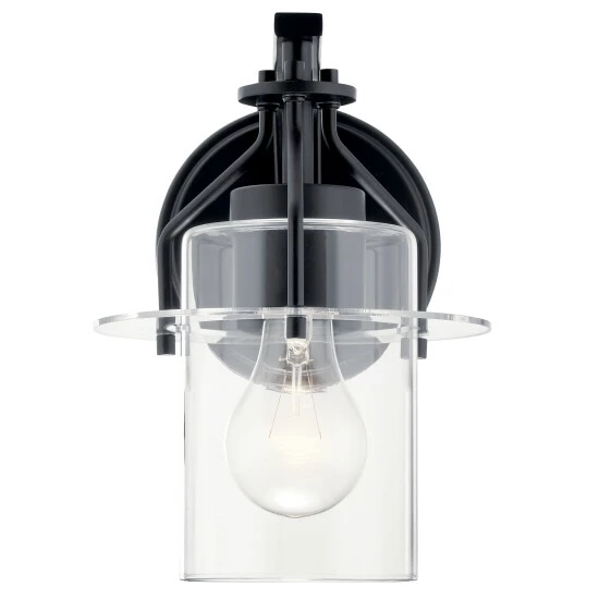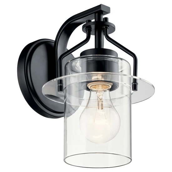 The Everett 9.25 inch 1 light wall sconce adds a dash of industrial glam to your space. A mini Clear Glass pendant is suspended from a curved arm and round backplate in Black. A delicate disc detail helps hold the pendant β and your attention.