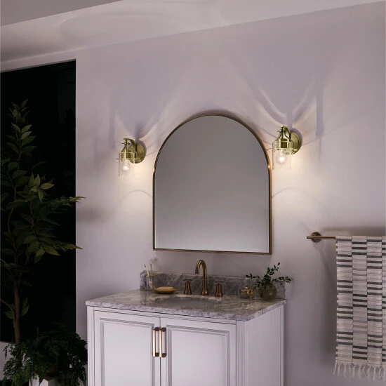 The Everett 9.25 inch 1 light wall sconce adds a dash of industrial glam to your space. A mini Clear Glass pendant is suspended from a curved arm and round backplate in Natural Brass. A delicate disc detail helps hold the pendant β and your attention.