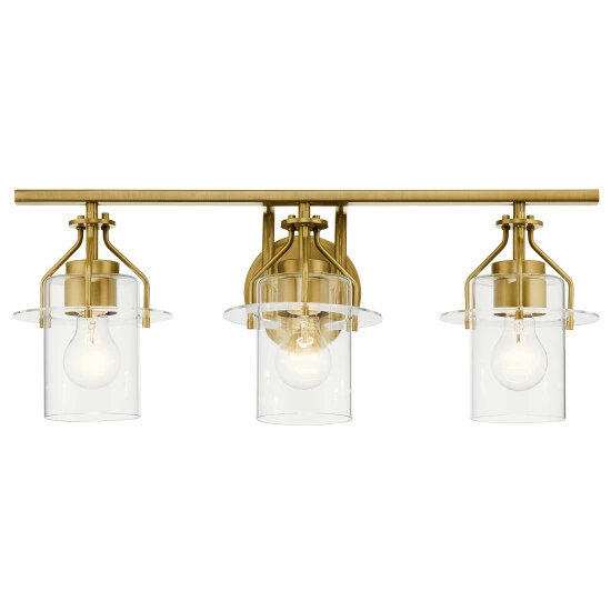 The Everett 24 inch 3 light vanity light adds a dash of industrial glam above your bathroom mirror. Three mini Clear Glass pendants are suspended from curved arms and a round backplate in Natural Brass. Look closely, and you’ll see delicate discs hold each pendant β and your attention.